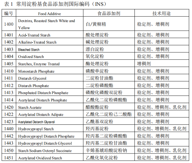 被廣泛應(yīng)用在食品領(lǐng)域的變性淀粉類型主要有酯化、醚化、氧化、交聯(lián)等, 以及上述類型的復(fù)合變性,表 1 列出了常用淀粉基食品添加劑國際編碼[4]。木薯 淀粉具有許多優(yōu)良特性適合加工變性淀粉,目前我國木薯變性淀粉產(chǎn)量已占變性 淀粉總產(chǎn)量 40%[5],本文針對木薯變性淀粉在幾個(gè)重要食品領(lǐng)域中的應(yīng)用作一些簡單闡述。
