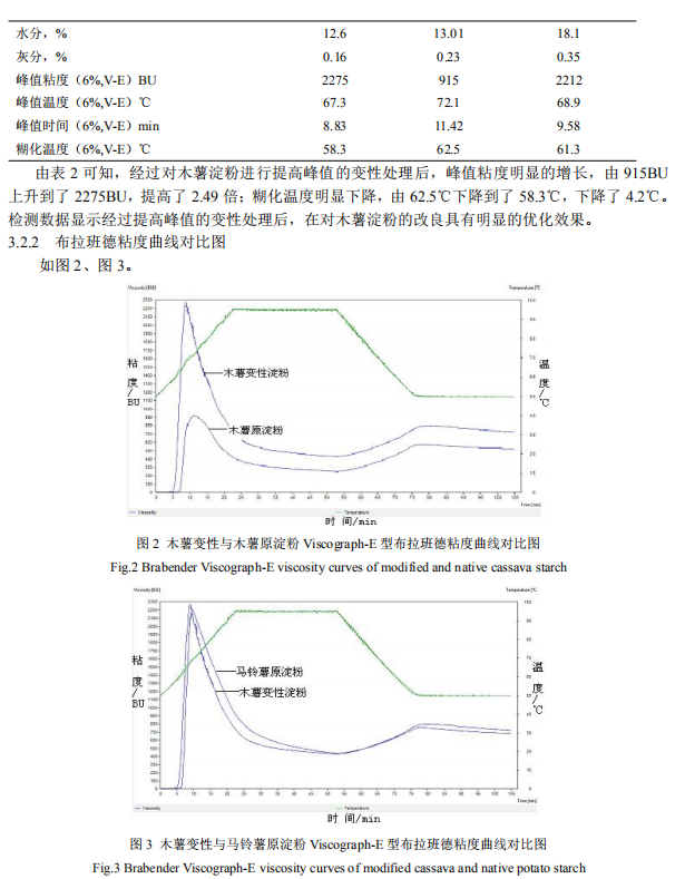 (1)高峰值木薯淀粉變性前后峰值粘度對比:2275÷915=2.49 倍;