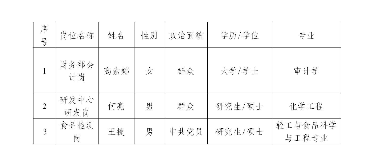 根據(jù)《廣西農(nóng)墾明陽(yáng)淀粉發(fā)展有限公司員工招聘管理辦法(試行)》(明淀發(fā)〔2011〕155號(hào))及2024年員工招聘相關(guān)工作要求,經(jīng)報(bào)名、資格審查、筆試、面試、考察(背景調(diào)查)、體檢等程序,經(jīng)研究擬聘高素娜等3人,現(xiàn)予公示,公示期從2024年6月13日至6月19日,公示期間如有異議,請(qǐng)于2024年6月19日前通過(guò)以下方式反映情況: