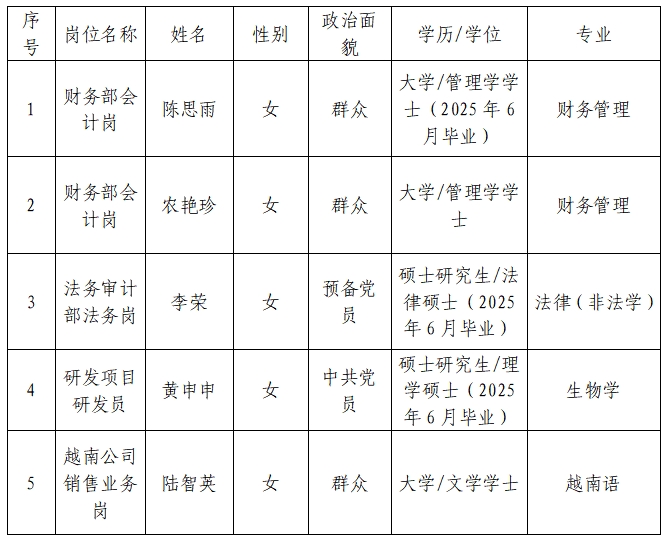 根據(jù)《廣西農(nóng)墾明陽淀粉發(fā)展有限公司(含明陽生化公司)員工招聘管理辦法(修訂)》(明淀發(fā)〔2024〕28號(hào))及2024年員工招聘相關(guān)工作要求,經(jīng)報(bào)名、資格審查、筆試、面試、考察(背景調(diào)查)、體檢等程序,經(jīng)研究擬聘陳思雨等5人,現(xiàn)予公示,公示期從2025年3月5日至3月11日,公示期間如有異議,請(qǐng)于2025年3月11日前通過以下方式反映情況: