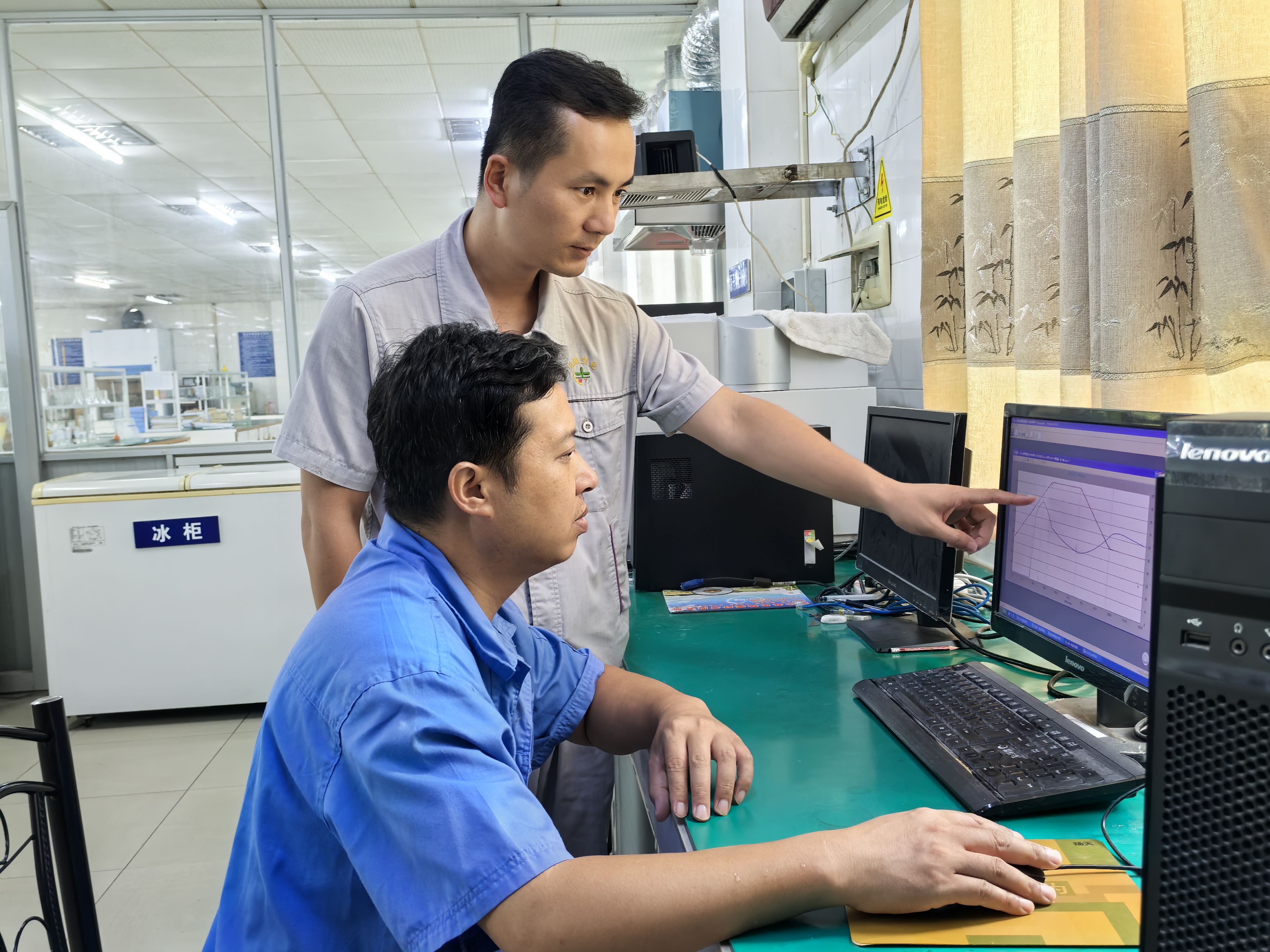 (▲黃自銘與技術(shù)員分析實(shí)驗(yàn)數(shù)據(jù))