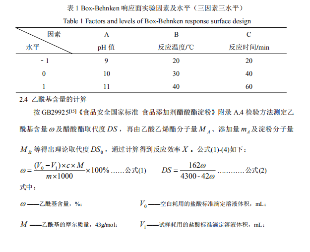 本文使用乙酸乙烯酯(VAC)為乙?;噭?,氫氧化鈉和鹽酸為酸堿調(diào)節(jié)劑,以乙?;?反應(yīng)效率作為評(píng)判指標(biāo)進(jìn)行實(shí)驗(yàn)設(shè)計(jì),考察三聚磷酸鈉(STPP)對(duì)醋酸酯淀粉性能的影響, 并通過(guò)響應(yīng)面設(shè)計(jì)得到優(yōu)化的實(shí)驗(yàn)方案。