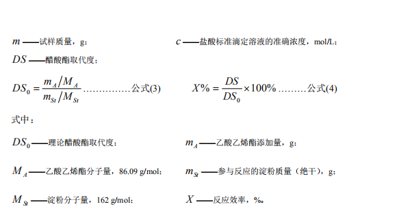 用燒杯稱(chēng)取 300g 木薯淀粉(絕干)加水調(diào)漿至濃度 35~40%,用 6%氫氧化鈉溶液調(diào)淀 粉漿液 pH 值 10 并攪拌 10 分鐘,控制反應(yīng)溫度 30~35℃,加入 VAC 攪拌反應(yīng) 40 分鐘,其 間反應(yīng)至 2 分鐘時(shí)調(diào)一次 pH 值 10,然后用鹽酸調(diào)節(jié)漿液至 pH 值 6~6.2 終止反應(yīng),再經(jīng)洗 滌、抽濾、烘干、粉碎、過(guò)篩,得醋酸酯淀粉 VAC-SA。