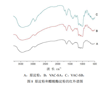 對(duì)原淀粉和醋酸酯淀粉 VAC-SA、VAC-SB 進(jìn)行紅外譜圖的分析,結(jié)果如圖 8 所示。
