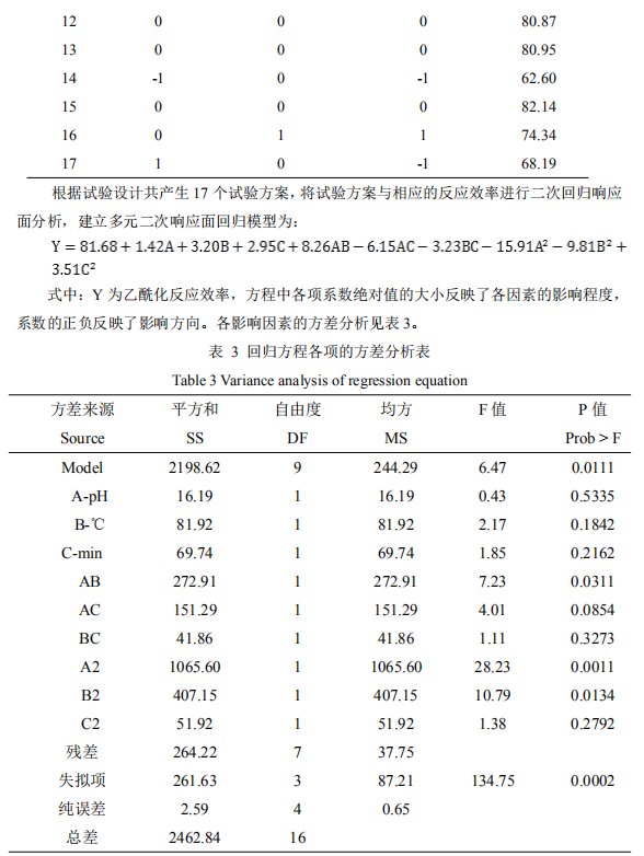 (2)響應(yīng)面實(shí)驗(yàn)所得最佳工藝條件為:反應(yīng) pH 值 9.83、反應(yīng)溫度 29.3℃、反應(yīng)時(shí)間60min,得到反應(yīng)效率理論值為 88.54%。在所得條件下進(jìn)行三次平行試驗(yàn)驗(yàn)證,得到醋酸酯 反應(yīng)效率的實(shí)際值為 87.39%。表明基于響應(yīng)面法優(yōu)化所得的實(shí)驗(yàn)結(jié)果與模型符合良好,該 模型能較好地模擬并預(yù)測(cè)醋酸酯反應(yīng)效率。